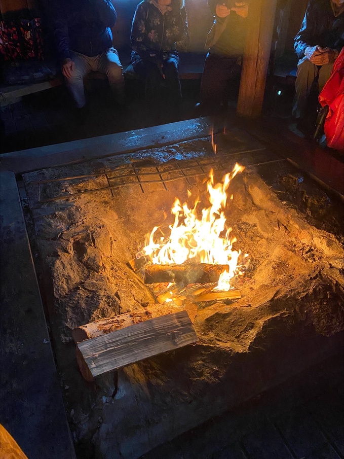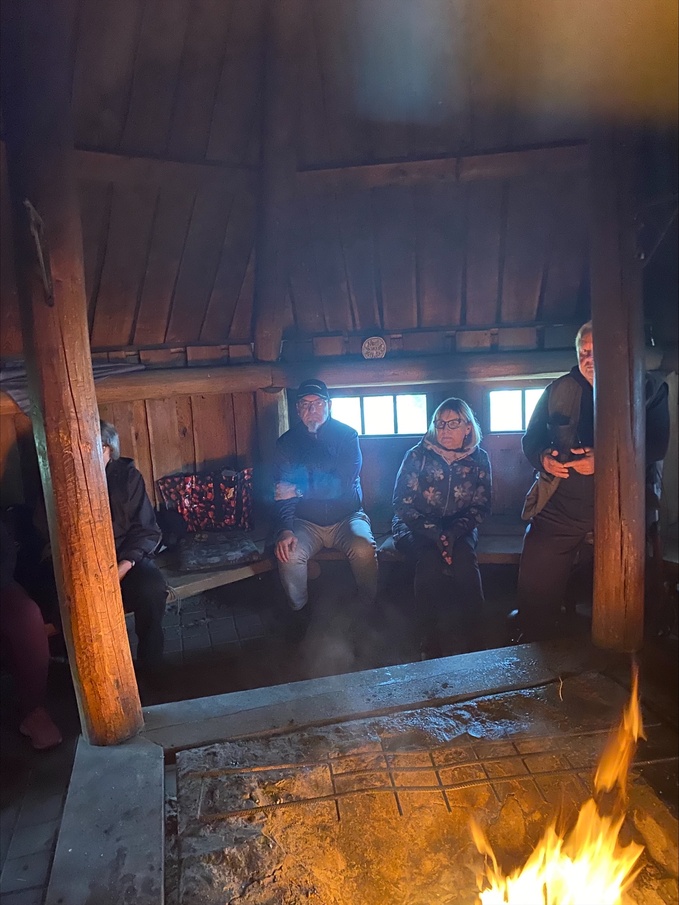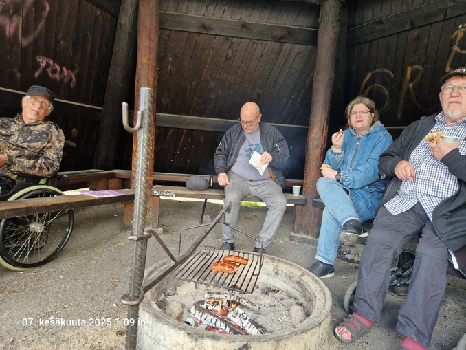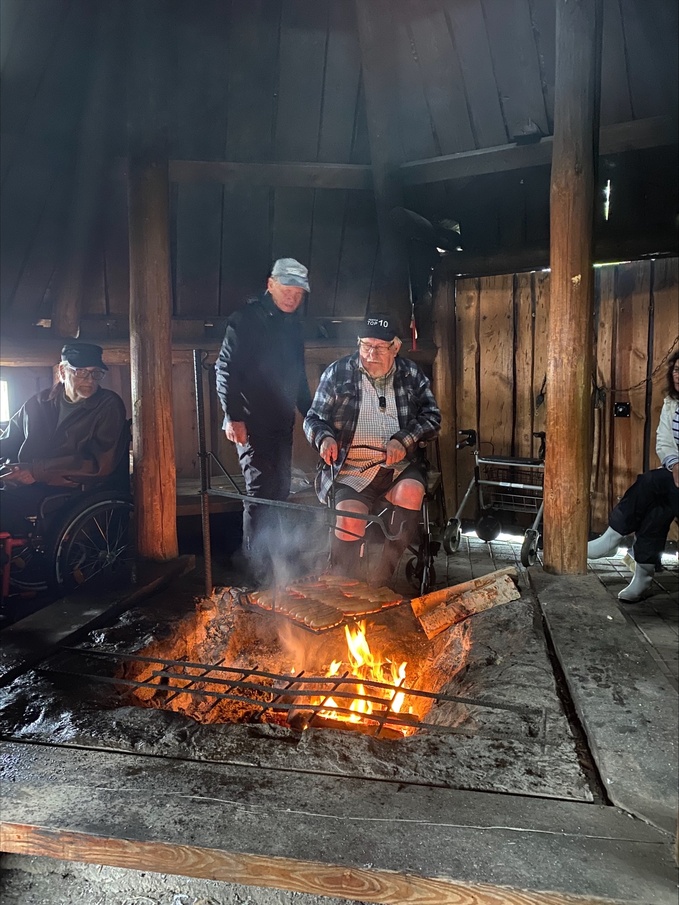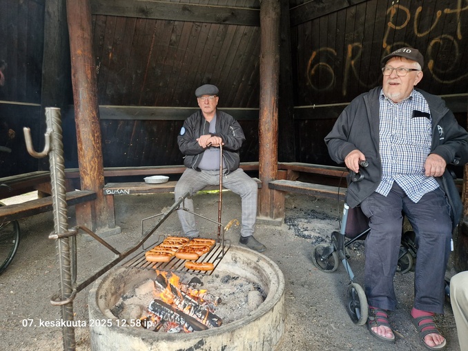 Runsaslukuinen joukko levittäytyi suojaan kodan penkeille nuotion ympärille lämpöön ja juttua piisasi. Ravintola Hugon tuomat makkarat ja munkit hupenivat hetkessä kahvin ja mehun kera.